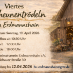 - Scheunentrödeln 2026Am Sonntag, dem 19.04.2026 findet unser Scheunentrödeln und Pflanzenmarkt statt. Interessenten sind gerne zum Mittrödeln und Verweilen eingeladen. Anmeldungen für Verkäufer nehmen wir bis zum 12.04.2026 unter hv-erdmannshain@gmx.de entgegen. Die Marktordnung finden Sie hier zum DOWNLOAD.